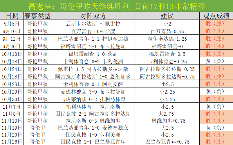 哥伦甲昨天胜利,目前17胜13,美洲赛事发挥出色。昨天5胜4,连胜2天胜+7,近7天胜6天胜+16,11月截至昨天胜+22,9月胜+11,10月胜+19,连续3月双位胜增长