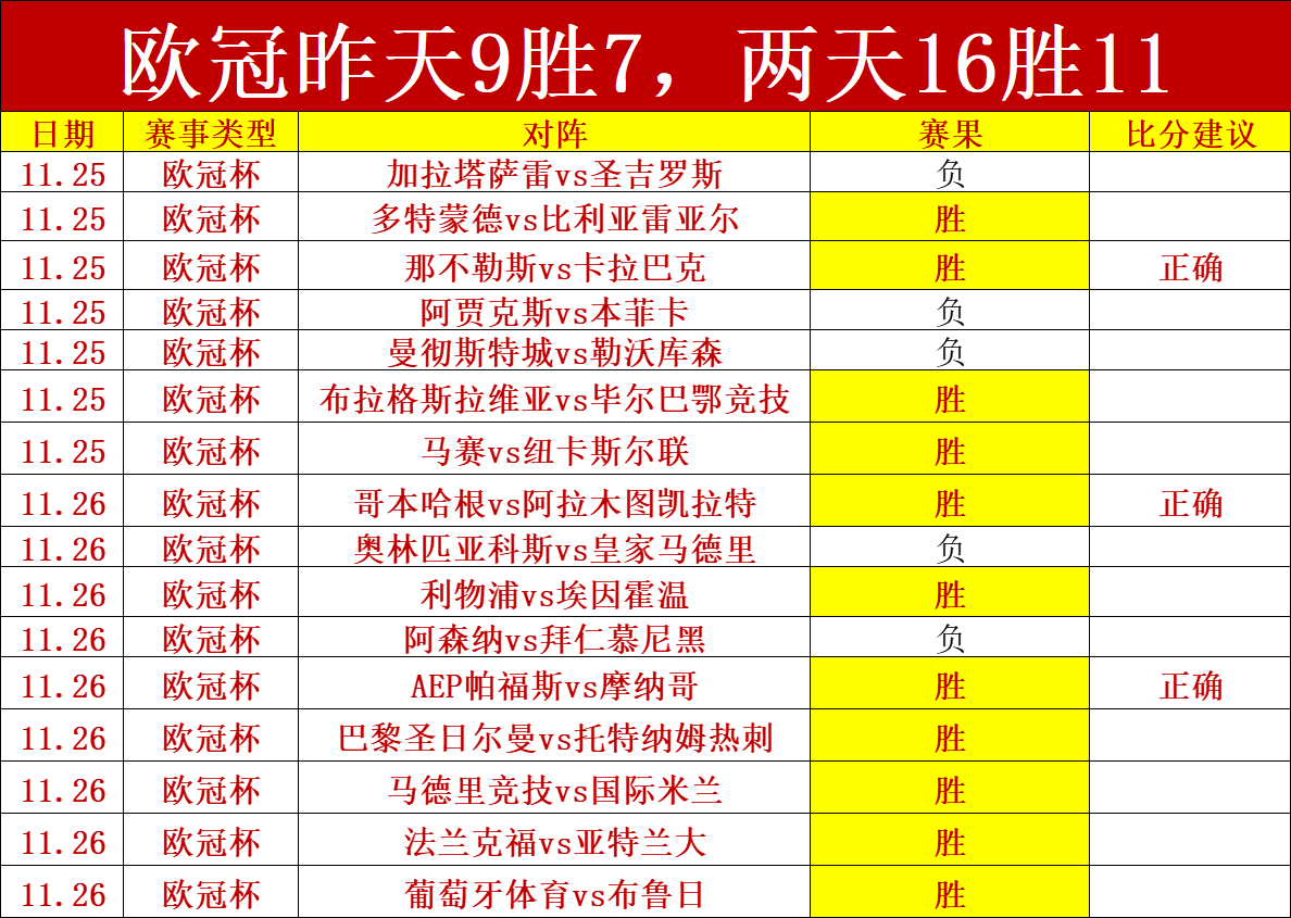 3、欧冠昨天合计拿下9胜7的佳绩,两天16胜11。