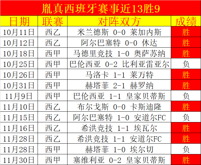 西班牙赛事13胜9,值得信赖的一场西杯分析。昨天4胜3大胜启动12月信心,11月取得93胜80负合计胜+13,10月取得89胜77负合计胜+12,合计胜+25,双位保持双位胜+非常出色