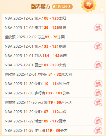 【成绩回顾】目前成绩近13胜8,整体相对稳定。今日针对WCBA以及NBA赛事进行临界值数据深研。