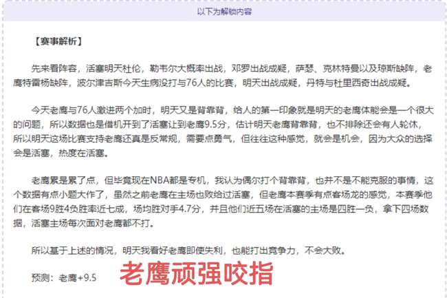 【昨天回顾】昨天NBA只精选了一场活塞vs老鹰,我看好的老鹰方向是稳稳打出。明天比赛不多,但这场马刺vs灰熊的比赛还是比较看好的,一起来分析!