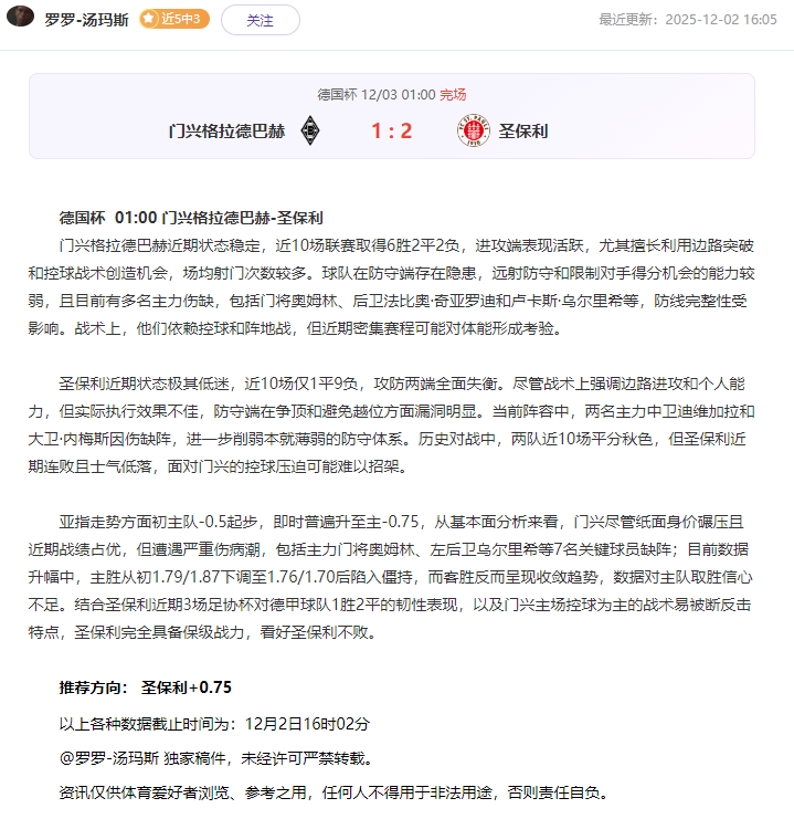 (昨晚公推单挑一场德国杯,圣保利+0.75情况下客场2-1精准命中,今晚深夜英超焦点首达数据方向继续锁定)