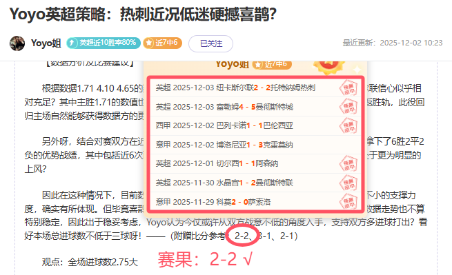 【上期回顾】:大获全胜!昨天私推英锦赛拿下,公推曼城成功冲击三连胜,另外超级重点英超方案彩蛋直接拿下,近5胜4的表现依然棒棒哒!——今天核心赛事已确认,信心依旧,各位可点击一下【赞赏】按钮给予鼓励,轻松在“站内信”获取当天新鲜信心专场哦!多一份参考离喜悦再近一步,Yoyo将继续率粉粉们继续前行~