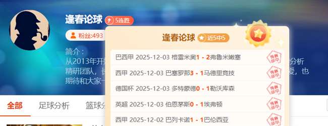 逢春论球本名朱逢春,早年担任足球解说员,从2013年正式入职足球分析师-对亚欧数据的变化套路了如指掌。2018年俄罗斯世界杯更是2次拿下任14(一奖),2023年欧洲杯拿下23连红的傲人战绩。抓冷门技术更是一把好手,最近两年更是凭借一手独家的四维彩超数据将胜率再拔新高!!