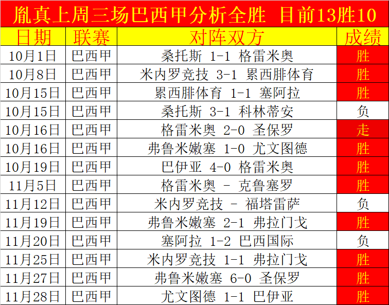 巴西甲上周进行了3场分析全取胜利,目前巴西甲近13胜10表现非常出色。12月刚开始保持正向胜+,11月取得93胜80负合计胜+13,10月取得89胜77负合计胜+12,合计胜+25,双位保持双位胜+非常出色