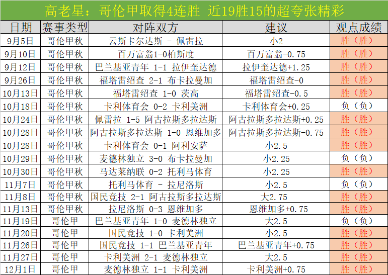 哥伦甲4连胜,近19胜15超级夸张的精彩,美洲赛事发挥出色。近13天胜9天胜+17,11月胜+22,9月胜+11,10月胜+19,连续3月双位胜增长