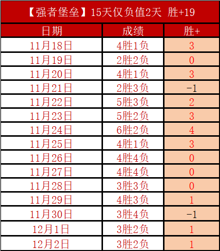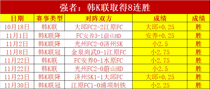 韩K联取得8连胜,亚系早场发挥就是精彩。12月两天连胜信心继续高企,近15天仅负值2天胜+19,11月胜+16,10月胜+16,连续两个月保持双位胜+发挥