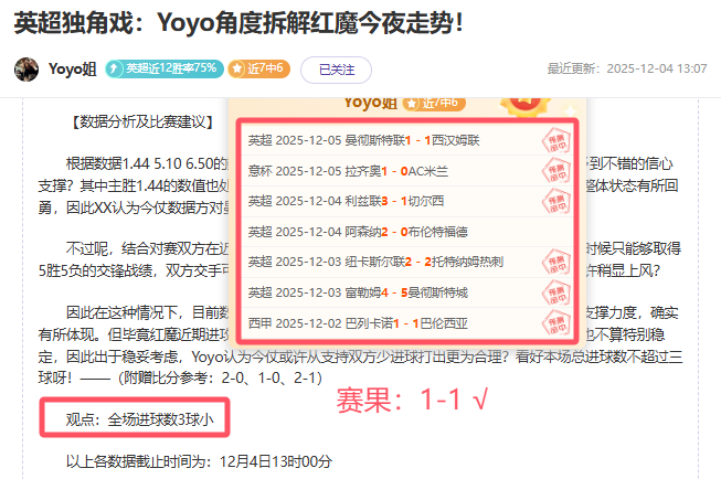 【上期回顾】:昨天私推暂停,公推意杯少进球成功冲击五连胜!另外超级重点英超方案少进球同样拿下,近7胜5的表现依然棒棒哒!——今天核心赛事已确认,信心依旧,各位可点击一下【赞赏】按钮给予鼓励,轻松在“站内信”获取当天新鲜信心专场哦!多一份参考离喜悦再近一步,Yoyo将继续率粉粉们继续前行~