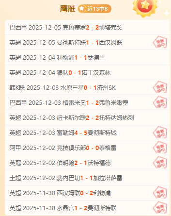 成绩回顾:昨日英超赛事取胜,近期13胜8。感谢一直以来的支持与陪伴,今天看好不错的赛事,强项赛事很有信心,鹰雁也曾创下19连胜的超高记录。愿大家在观赛的同时,也能收获满满的喜悦与惊喜,觉得还行的不妨继续关注,一起开启精彩的足球之旅。