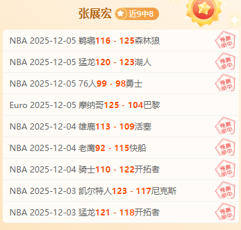 昨天3场NBA赛事取得全胜。近期9胜8,其中NBA赛事8连胜!张展宏继续深挖数据,不吹不擂真实成绩有目共睹。继续为大家送上高质量和专业的赛事理解,敬请大家关注!