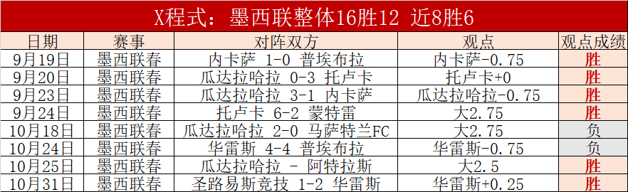 墨西联近8胜6,整体16胜12,墨西联一直都保持精彩。昨天胜利发挥,近7天精彩6天,上周六大胜,今天周末精彩信心更高