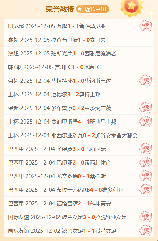 12月5天胜4天,拿下16胜10!最高打下14连胜的表现已见证实力。各线赛事都能保证清晰的解读思路与靠谱的选择方向!截至昨天荣誉教授已经有4335场解读经验,今天继续精选5场,多元化的赛事系列,以更高连胜胜利率绩迎接5000场记录来临,关注荣誉教授,成为荣誉教授的好伙伴!