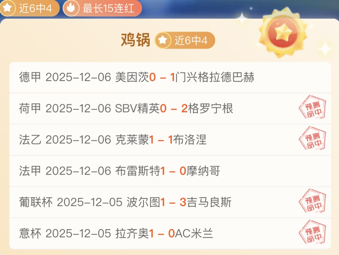 战绩回顾:昨日赞赏数据1场,法乙格勒诺布尔完美全胜,赞赏数据拿到连胜!总进球数1场,荷乙瓦尔韦克小方向走了,总进球数依然近12胜9,成绩很出色!【超级重点】依然保持5胜4!解锁文章4战拿到1胜1走2负,成绩不佳!鸡锅不追求场次多,追求少而精准,绝不滥竽充数,必须把老铁们的每一份信任都转化为胜利!