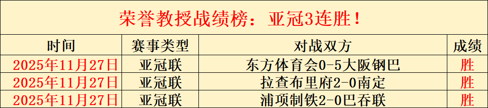 亚冠3连胜!最高打下14连胜的表现已见证实力。各线赛事都能保证清晰的解读思路与靠谱的选择方向!截至昨天荣誉教授已经有4350场解读经验,今天继续精选5场,多元化的赛事系列,以更高连胜胜利率绩迎接5000场记录来临,关注荣誉教授,成为荣誉教授的好伙伴!