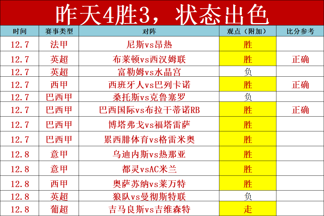 1、昨天状态十分炸裂,加上私推6场仅失1,有效成绩5胜4,意甲2场也大获全胜,终于迎来了笔者的重中之重的欧战了,欧冠近9胜7,敬请期待。