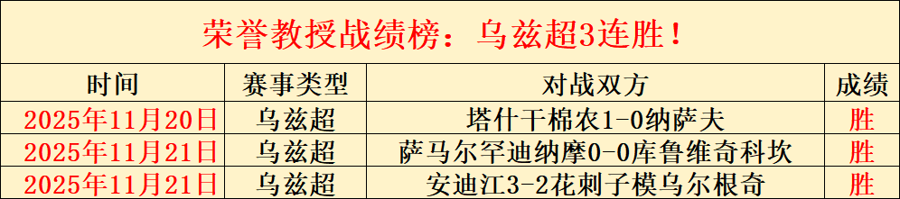 昨天5失2!乌兹超3连胜!最高打下14连胜的表现已见证实力。各线赛事都能保证清晰的解读思路与靠谱的选择方向!截至昨天荣誉教授已经有4355场解读经验,今天继续精选5场,多元化的赛事系列,以更高连胜胜利率绩迎接5000场记录来临,关注荣誉教授,成为荣誉教授的好伙伴!
