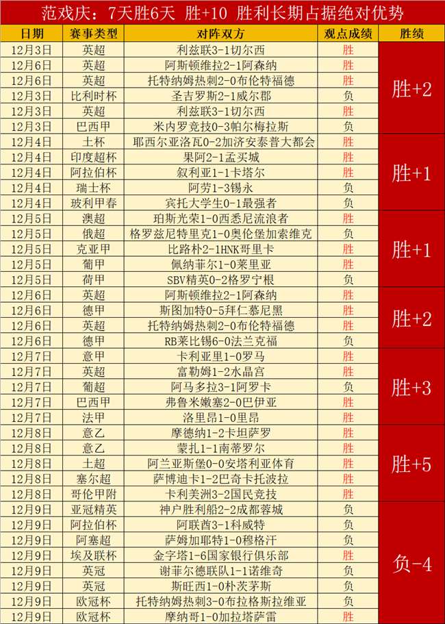 7天胜6合计胜+10,胜利一直占据绝对优势。11月胜+33,10月10-31日合计胜+23,长期保持精彩发挥