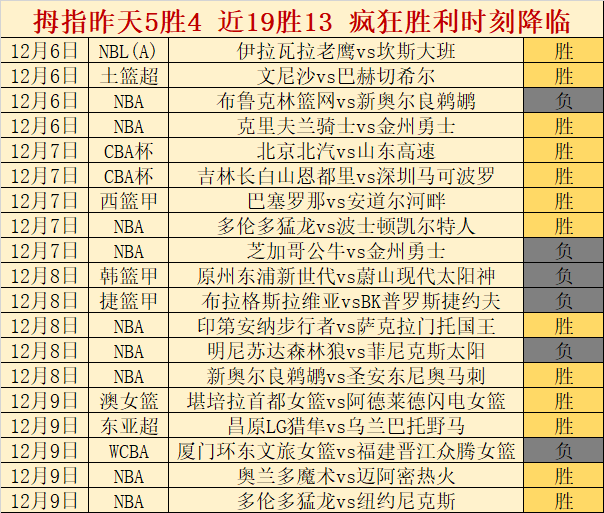 NBA昨天全胜,连胜2天,近8胜6,NBA发挥得很好。昨天拿下5胜4,近19胜13,胜+7,状态很好,疯狂取胜时刻再度降临