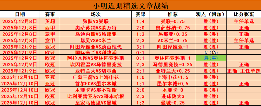 【上期回顾】全胜!全胜!全胜!昨文章5场全胜,申花、墨尔本城、曼城、本菲卡、黄潜大全出。6连胜,本周3天13胜12,五星2场也全对,五星近7胜6。这一周朋友们大丰收,今天继续一起冲!