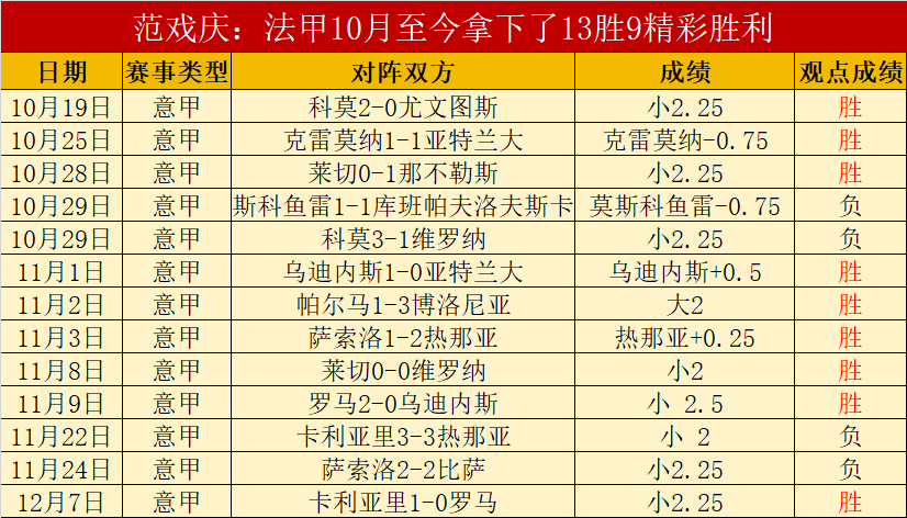 意甲整体16胜12,10月至今13胜9,五大联赛分析意甲更出色。9天胜7天胜+10,11月胜+33,10月10-31日合计胜+23,胜+数值突出,胜利一直占据绝对优势,长期全面支持胜利效果明显