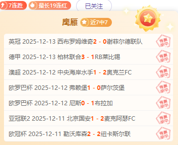 成绩回顾:昨日又是三场比赛以全胜之姿拿下,斩获7连胜,近期成绩15胜13。感谢一直以来的支持与陪伴,今天看好不错的赛事,强项赛事很有信心,鹰雁也曾创下19连胜的超高记录。愿大家在观赛的同时,也能收获满满的喜悦与惊喜,觉得还行的不妨继续关注,一起开启精彩的足球之旅。