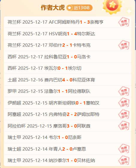 成绩回顾:近13中8!火热状态继续,成绩维持在稳定水平上,今天继续分享五场信心比赛给大伙,希望大家持续关注作者大虎。