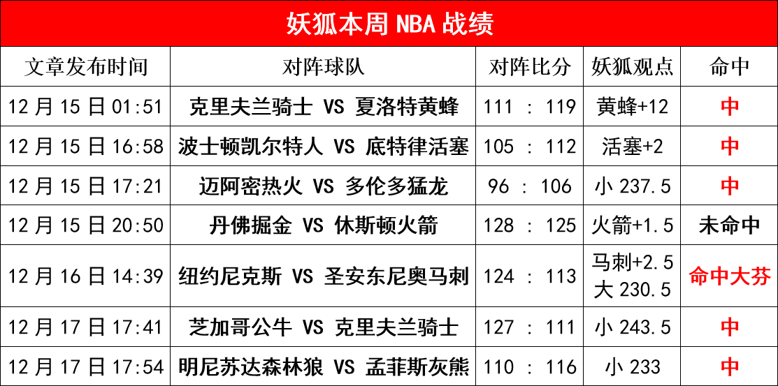 来啦来啦,今日两场NBA全拿下,状态还是一如既往得稳定,本周7中5,其中杯决赛那场也是有命中大,小,不过统计的战绩没有涵盖,这是妖狐自己制作的战绩表格,如有虚假可以举报!