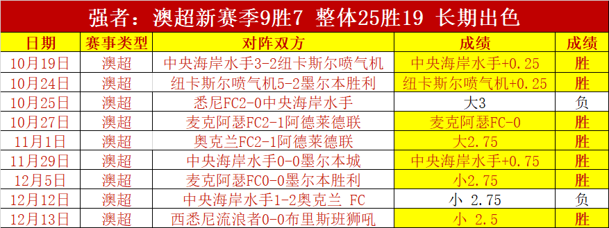 近一次澳超13号拿下胜利,澳超本赛季11胜9,整体25胜19,长期出色。11月胜+16,10月胜+16,过去两个月合计胜+32,月成绩非常精彩