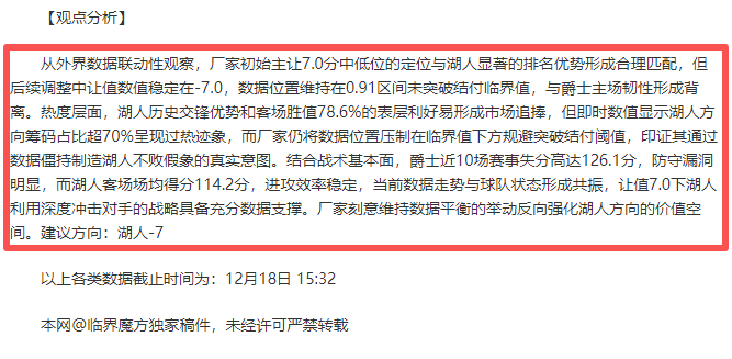 从数据层面观察,外界主流厂家初始让值多数设定在6.5分,但即时调整中统一升至7.5分,如主流体系从初6.5升至即7.5,也有从初6.5升至即7.5,这种集体调整与主队主场优势形成矛盾,暗示厂家可能在刻意引导市场预期。总分方面,初盘普遍在162.5至164.5分之间,但即时均降至162.5分,厂家对进攻效率的谨慎态度与两队近5次交锋场均产生83.3%大比分的历史数据产生背离。胜负数值方面,主胜初盘平均值1.34,即时降至1.30;客胜初盘平均值3.15,即时升至3.43,主胜数值下降但让值上升,这种异常波动可能存在制造客队不败假象的意图。临界值分析显示,让值调整后数据位置未突破结付临界值,厂家通过手法规避风险,但与球队实际状态形成反差,进一步加深数据可信度的疑虑。