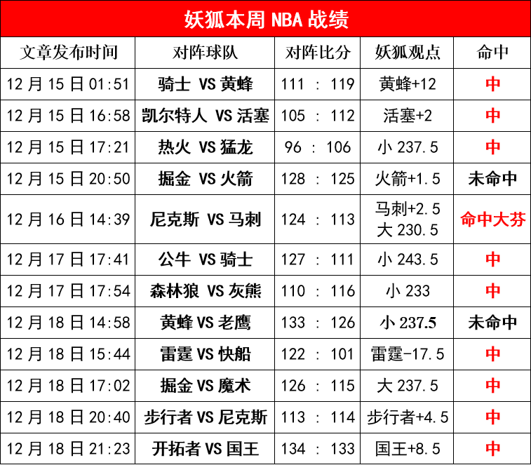 今日NBA5中4!!本周12中9,目前处于4连胜,其中杯决赛尼克斯那场也命中大,小,妖狐继续给各位制作了一个战绩图,如战绩有误可进行举报: