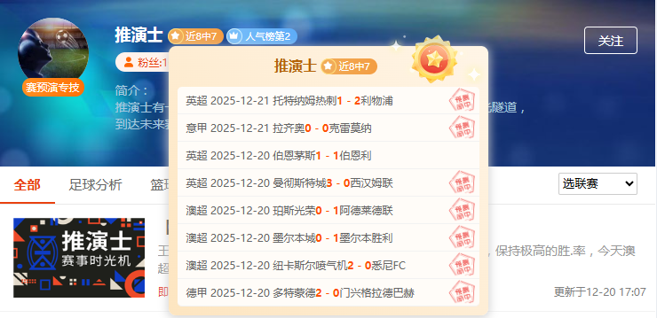 “推演士”以其极高的推荐效率著称。近期8场推荐命中7场,87.5%的命中率堪称恐怖,完美诠释了“效率即王道”。他的分析仿佛拥有到达未来的洞察力,总能精准推演出比赛的关键走向。对于注重短期高效、追求极速回报的用户,这位效率大师不可错过。