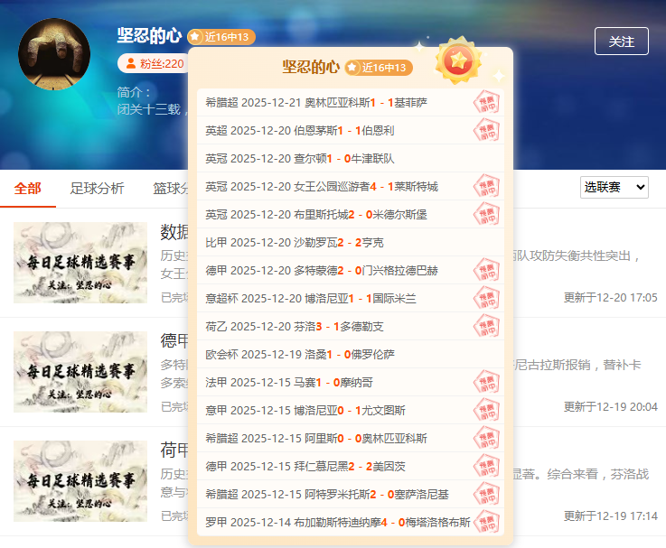 这位拥有超过12年深度研究经验的资深分析师,已进入一个惊人的稳定输出阶段。近期16场推荐命中13场,高达81%的命中率充分展现了其分析体系的成熟与可靠。他的推荐涵盖各大主流联赛,凭借深厚的功底蕴蓄发力,是追求长期稳定参考的基石型选择。