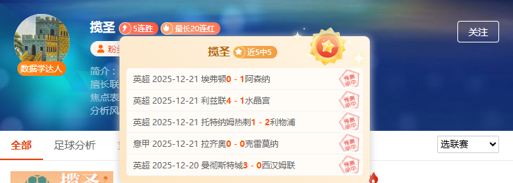“揽圣”是一位典型的数据流实战派,擅长运用多维度数据模型解析比赛,直击核心。目前正以一波干脆利落的5连胜强势前进,其推荐逻辑清晰,结果导向明确。对于相信“数据不说谎”、偏爱理性分析的用户而言,他是值得信赖的战场先锋。