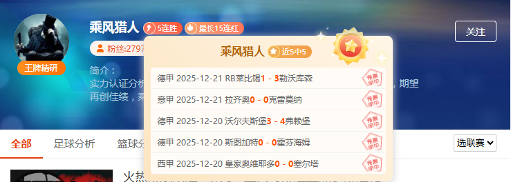 正如其名,“乘风猎人”善于捕捉球队状态的乘风之势。目前手感滚烫,正处于5连胜的节奏中,更曾创造过15连红的惊人纪录,证明其捕捉高光期的能力极强。他的分析敏锐果断,跟随他,旨在把握住那些状态正佳的队伍带来的红利期。