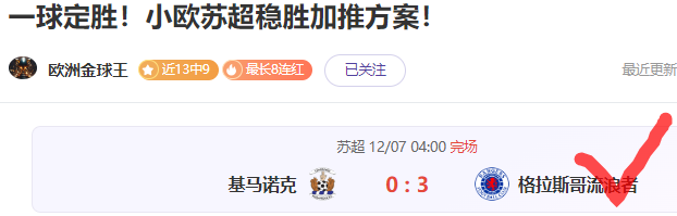 一球定胜近13中9!小欧苏超稳胜加推方案!