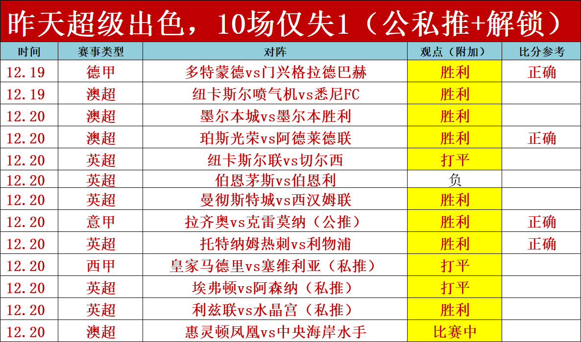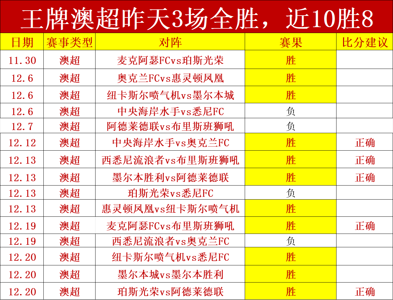 昨天超级出色,10场观点仅失1场(公推+私推+解锁),王牌澳超势不可挡,昨天3场大获全胜,澳超目前近10胜8,王牌澳澳超继续保持极高的胜.率,今天乘胜追击。