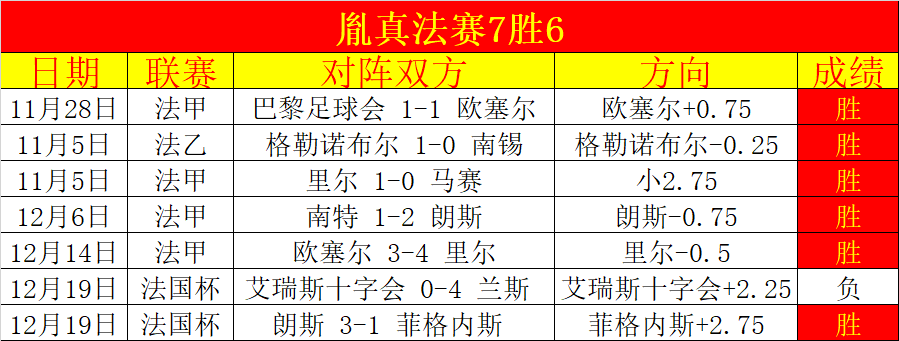法赛7胜6,对法国杯分析信心大大提振。11月胜+13,10月胜+12,月发挥非常出色