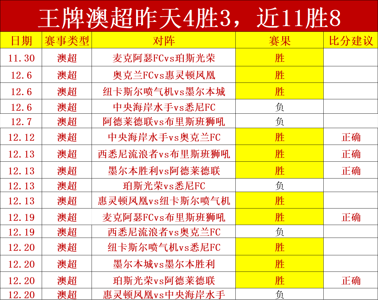 昨天超级出色,11场观点仅失2场(公推+私推+解锁),王牌澳超势不可挡,昨天4胜3,澳超目前近11胜8,王牌澳澳超继续保持极高的胜.率,今天乘胜追击。