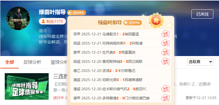 【叶指导优势】2016年国内知名数据分析团队离职,期间组织个人团队深耕足球领域至今已近10年。团队精于情报梳理及数据解读。亚欧赛事数据库全面,见微知著,坚信数据才是解析赛果直观体现。
