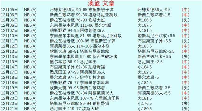 新西兰破坏者上赛季是10胜19负,进攻端85数据左右,防守端91数据左右,防守端漏洞百出,新西兰破坏者主场是6胜9负,客场是4胜10负,上赛季无缘季后赛。休赛期,有引进一些球员,但同时也有一些球员离队,近期新西兰破坏者的一些比赛情况,2025-12-19 坎斯大班99-95 [48-43]新西兰破坏者,新西兰破坏者客场是战败了,表现不佳,被逆转了,近期的新西兰破坏者遭遇2连败了,2025-12-13东南墨尔本凤凰92-80 [44-41]新西兰破坏者,2025-12-06新西兰破坏者99-86 [52-41]塔斯马尼亚跳蚁,2025-12-03新西兰破坏者95-90 [49-47]悉尼国王,2025-11-22坎斯大班96-102 [44-47]新西兰破坏者,本场比赛一起看看。