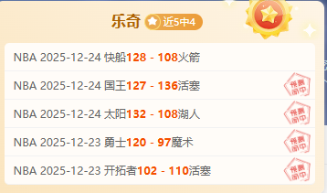 成绩来到5中4,这几天NBA都是良好状态!比赛方向都被笔者稳稳拿捏!也请大家点下关注,昨天休息一天,今天笔者继续为大家深研信心的比赛;大家可以持续关注乐奇了解赛事的走向。