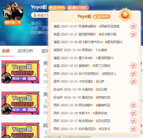 【上期回顾】:昨天公推澳超阿德莱德重返胜轨,而超级重点英超方案与胜利擦肩而过很可惜,近期多次拿下彩蛋依然棒棒哒!——今天核心赛事已确认,信心依旧,各位可点击一下【赞赏】按钮给予鼓励,轻松在“站内信”获取当天新鲜信心专场哦!多一份参考离喜悦再近一步,Yoyo将继续率粉粉们继续前行~