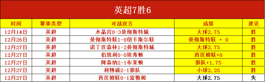 昨天5胜4,23号-27号近5天净胜+13,12月分享27天胜20天,净胜+17,长期稳定胜利值得信赖!英超7胜6!今天赛事依旧选择强项系列,持续稳,别错过了!笔者近期前进脚步表现仍然优秀,本日赛程继续出击,争取在稳健的基础上进一步突破!