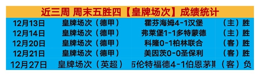 每天仅一场【皇牌场次】近三个周末五场皇牌拿下四场(弗莱堡,霍芬海姆,柏林联合,圣保利),长线近42拿下31场;适合长期定投的老板!今晚继续冲击英超 不容有失!