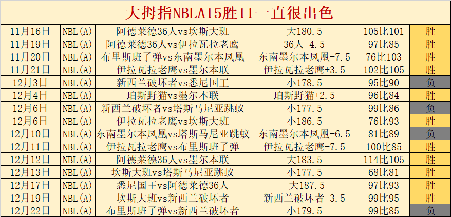 NBLA15胜11,这个赛事一直很出色。近23天胜15天合计胜+18,非常惊人的胜+表现