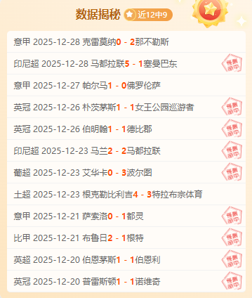近期成绩12胜9,状态稳定。祝大家生活如足球赛场般精彩,好运相伴,胜利连连!数据揭秘保持长胜心态,看到的朋友不要再犹豫了。