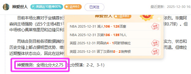 【作者前言:一名深耕足球篮球赛事领域的文字创作者,独创“数据+战术+心理”三维分析法,为粉丝提供独家前瞻内容。此前重点方案中的英超+NBA再次拿下,希望2026年各位继续关注,福利多多!】