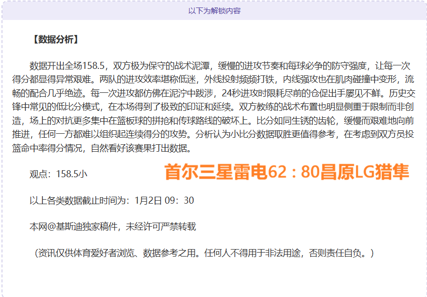 【成绩回顾】近11胜7,昨CBA和韩篮甲获胜!精选比赛拆解本期再创连胜新高度,篮球方向连胜呈现非同凡响,拆解精准比赛继续收获连胜,篮球板块拆解数据勇往直前,资深篮球爱好者,用独立方式拆解赛事再为大家奉上。以下再为大家分享一场精彩赛事,敬请期待!