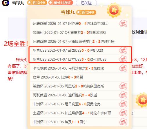 昨天亚青赛2场全胜,近12胜9,1月连续7天保持胜利,31场20胜,7天净胜+9,12月净胜+15。持续关注的粉丝有福了,长期稳定的胜利表现,当然值得信赖!别错过了,2026年更加美好,看好的朋友别犹豫!今天赛事依旧选择强项系列,笔者近期前进脚步表现仍然优秀,本日赛程继续出击,争取在稳健的基础上进一步突破!