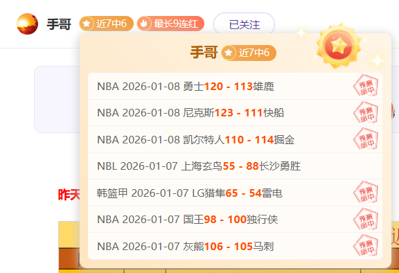 NBA昨天3场全胜,目前取得6连胜精彩发挥。昨天5胜4,近7胜6,连续取得胜利目前状态很好